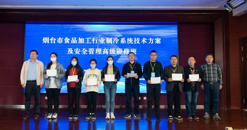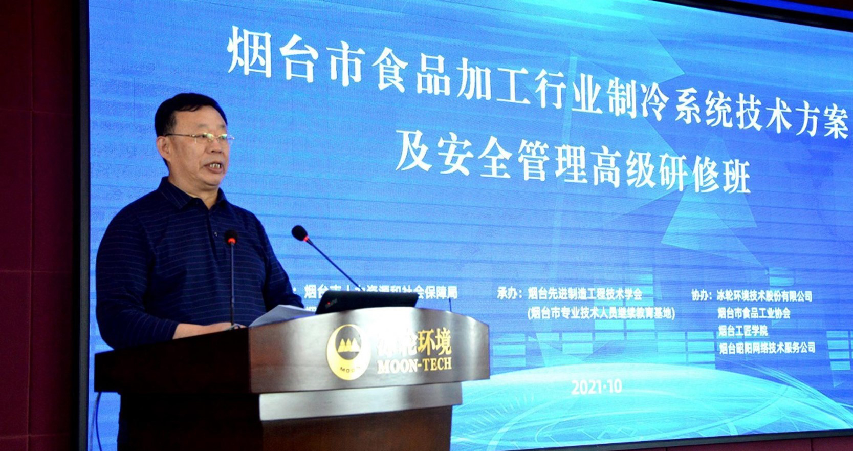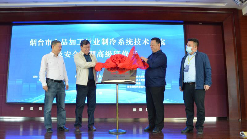 10 月 11 日,由烟台市人力资源和社会保障局、烟台市应急局主办,烟台先进制造工程技术学会(烟台市专业技术人员继续教育基地)(以下简称学会继续教育基地)承办的“2021 年烟台市专业技术人才知识更新工程全市食品行业制冷系统技术方案及安全管理高级研修班”在冰轮集团会议中心正式开班。在开班仪式上,市人社局高培龙副局长、刘安鹏主任,烟台先进制造工程技术学会理事长张永治、副秘书长栾琪文等领导为“学会继续教育基地”揭牌。