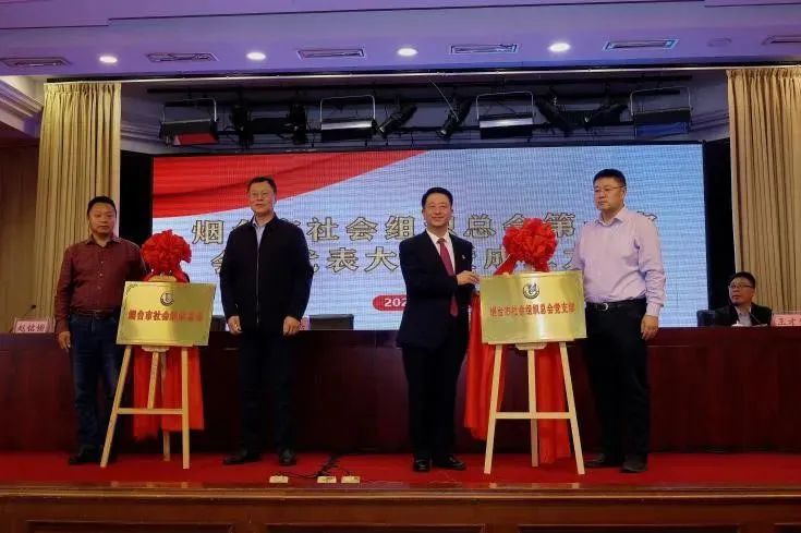 王培杰局长与孟洪波科长共同为烟台市社会组织总会揭牌,赵铭锴局长与杨希勇会长共同为烟台市社会组织总会党支部揭牌。