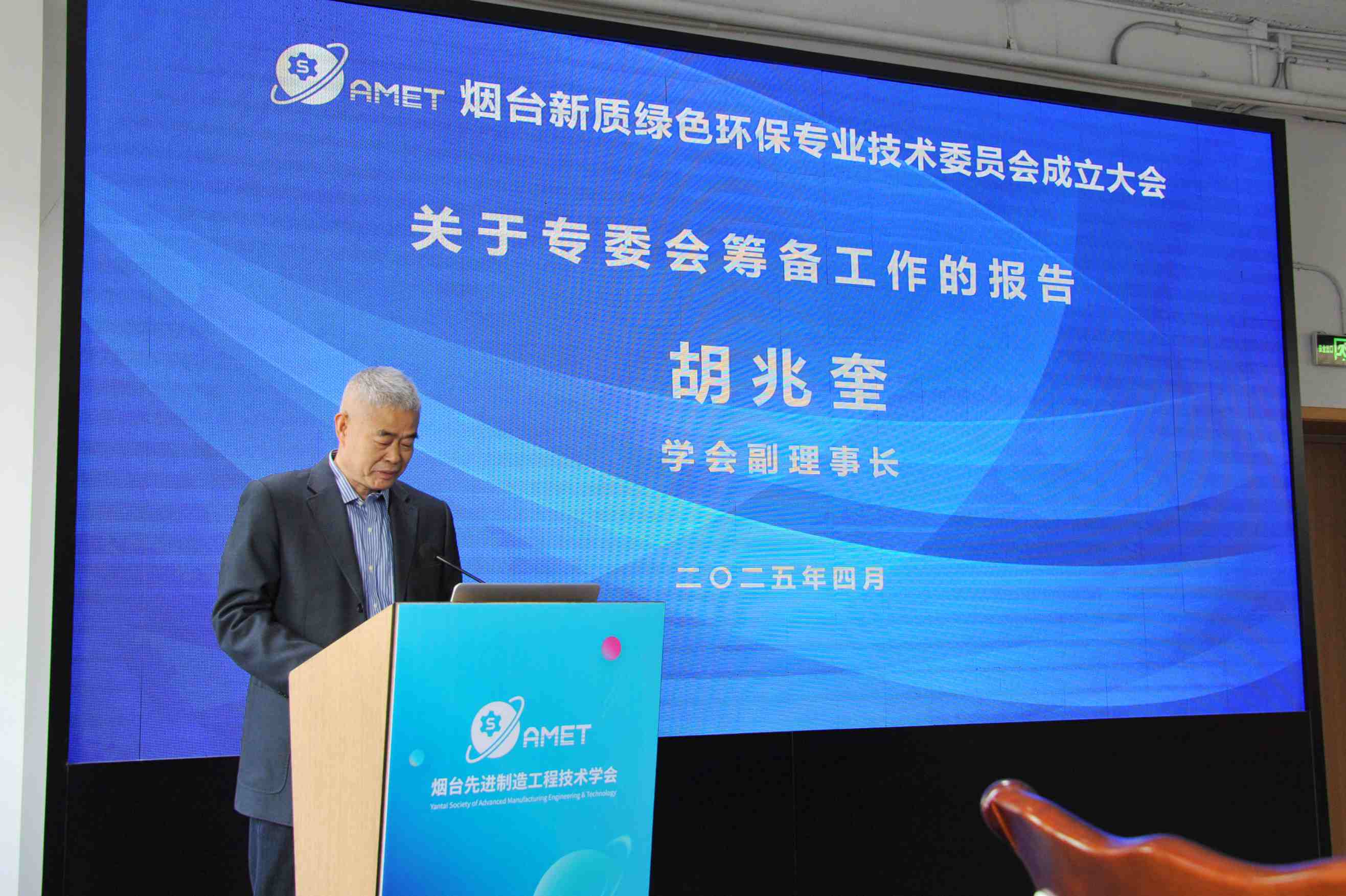 (图为:副理事长胡兆奎作“关于烟台新质绿色环保专业技术委员会筹备情况的说明”。)
