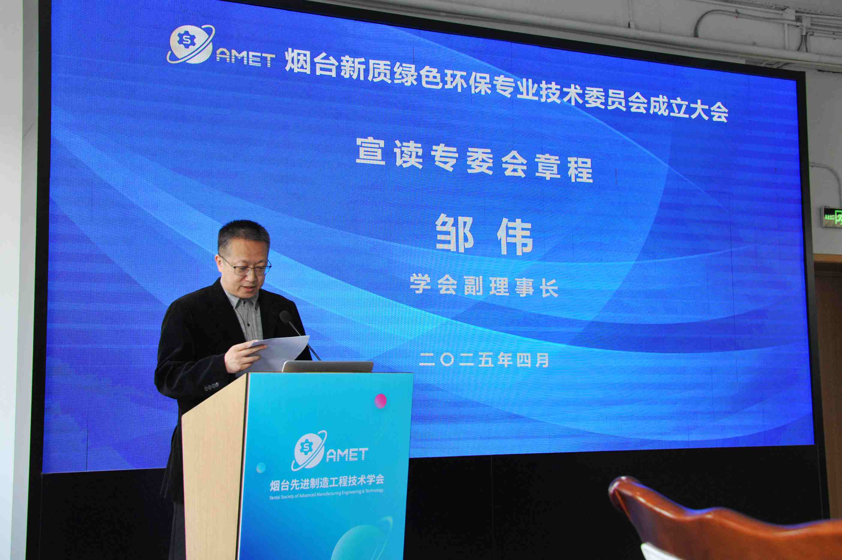 (图为:副理事长邹伟宣读了“烟台新质绿色环保专业技术委员会章程”草案。)